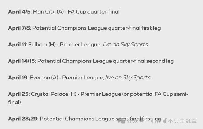 下图:利物浦4月份的潜在赛程: